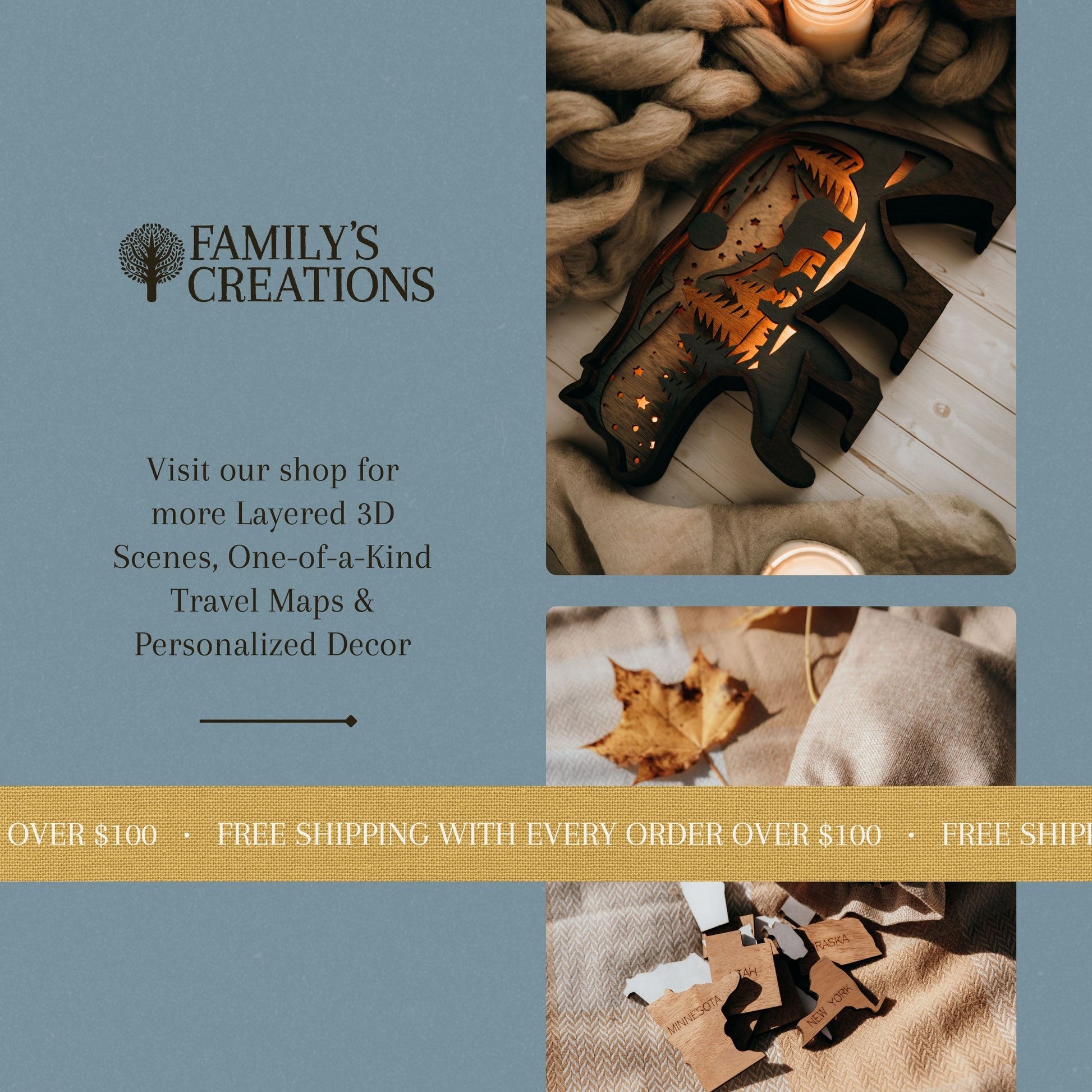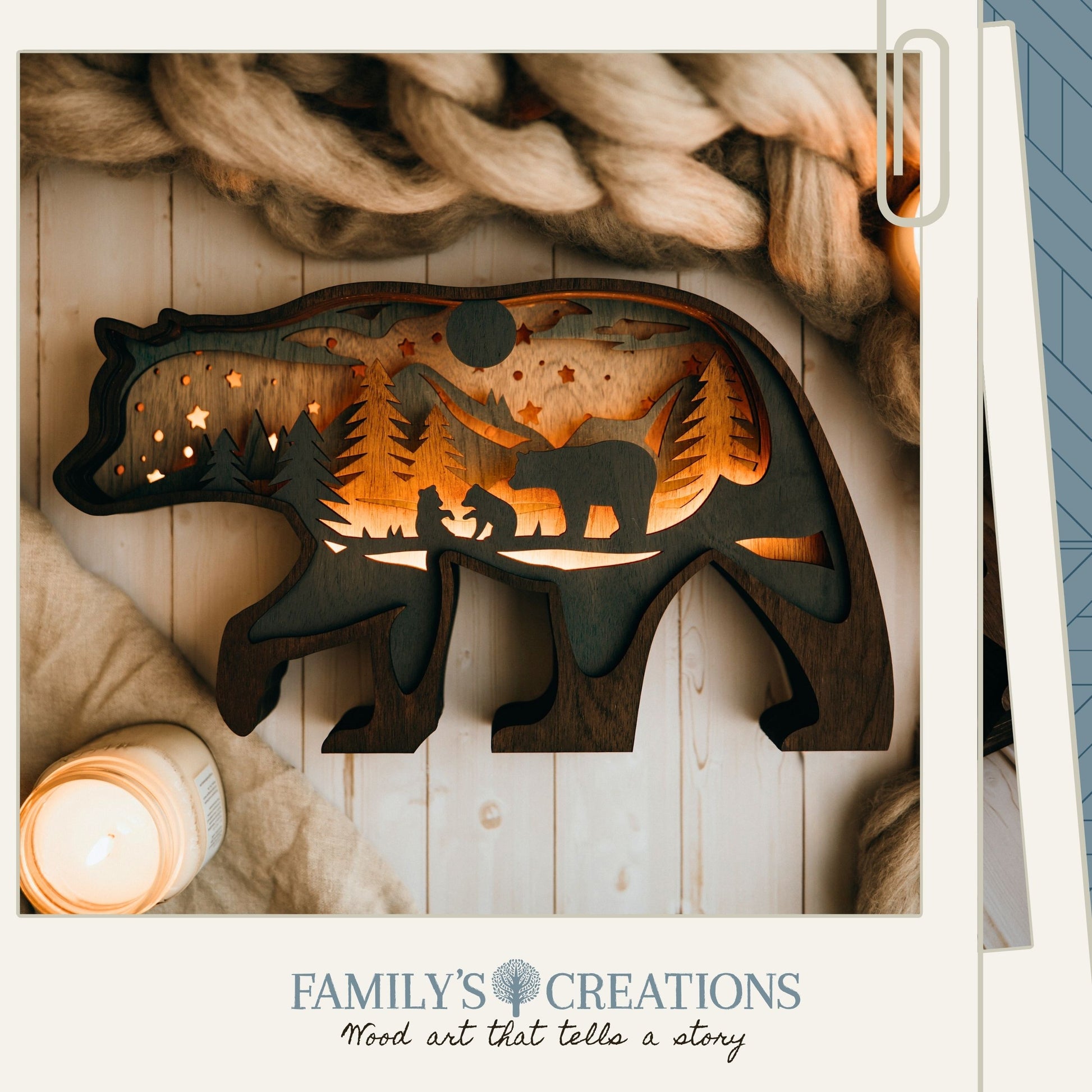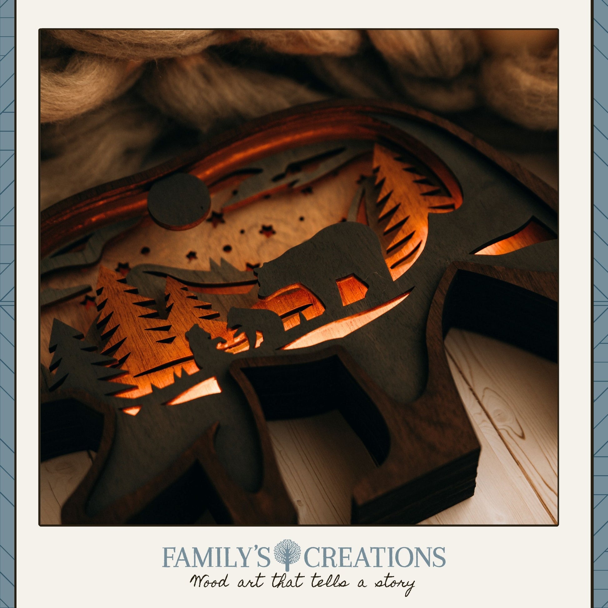 This rustic layered wood art piece brings the wilderness to life in a silhouette that’s as strong as it is peaceful — a bear carrying the forest and her playful little ones within. Warm LED lights are tucked between layers, casting a soft backlight that gently highlights the trees, stars, and layered night sky from behind.