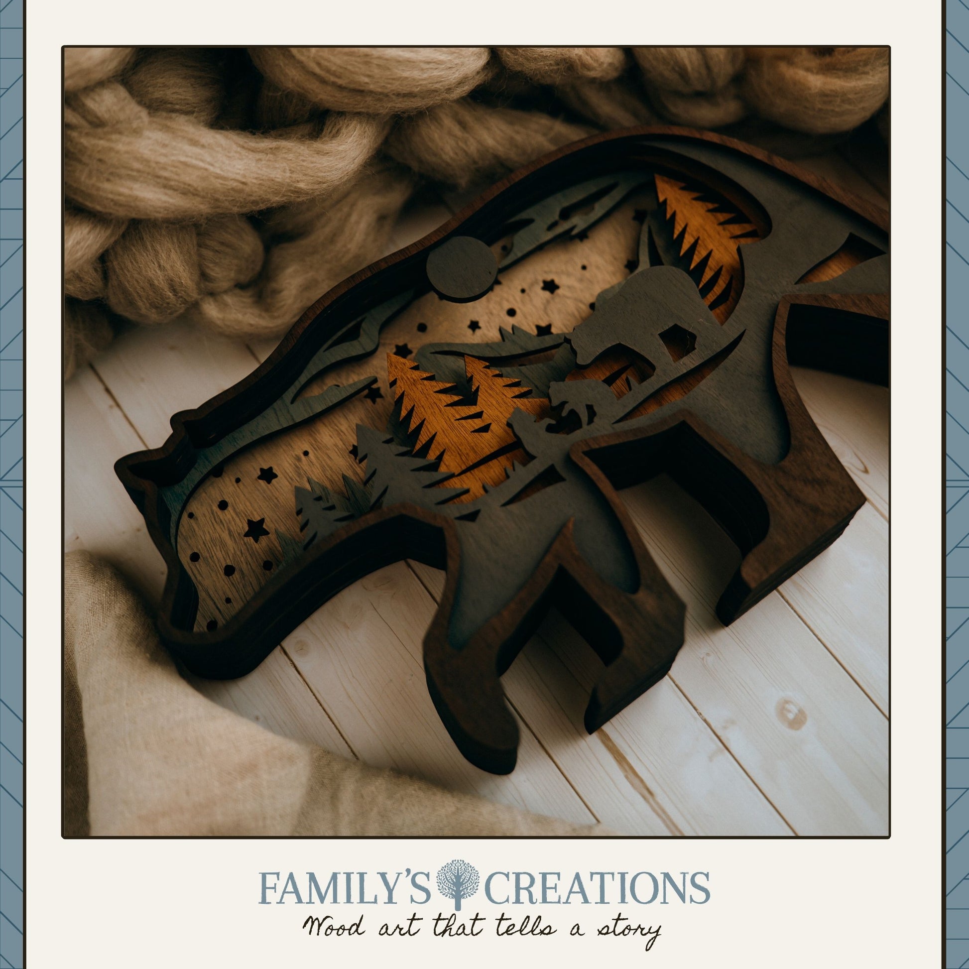 Crafted from natural wood and fully stained to enhance its texture and grain, this design is all about contrast, depth, and the quiet strength of the wild. Whether you see it as a mama bear and her cubs, or just a moment of peace under the moonlight — this piece is meant to hold meaning.