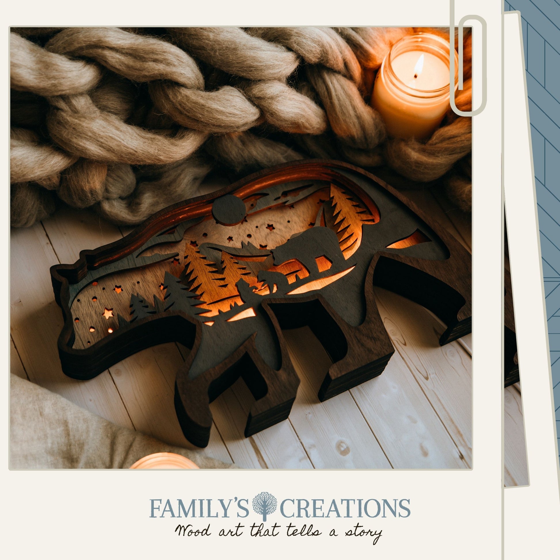 This bear makes a beautiful addition to cozy corners, peaceful nurseries, cabins, or anywhere that honors family, strength, and quiet wild places, this lighted scene adds ambiance and soul to your space — not just light.