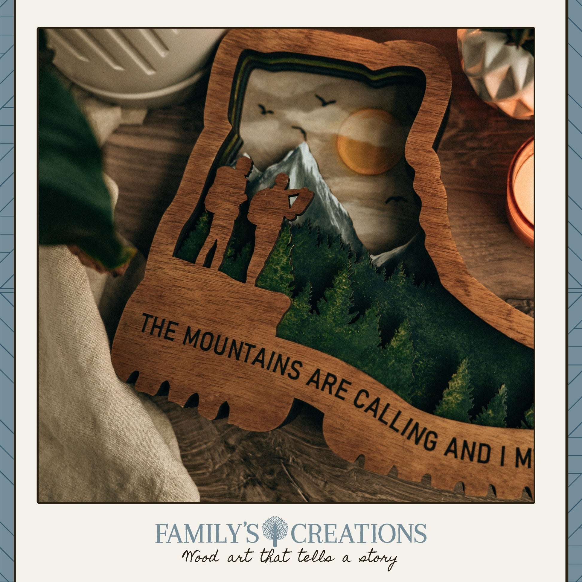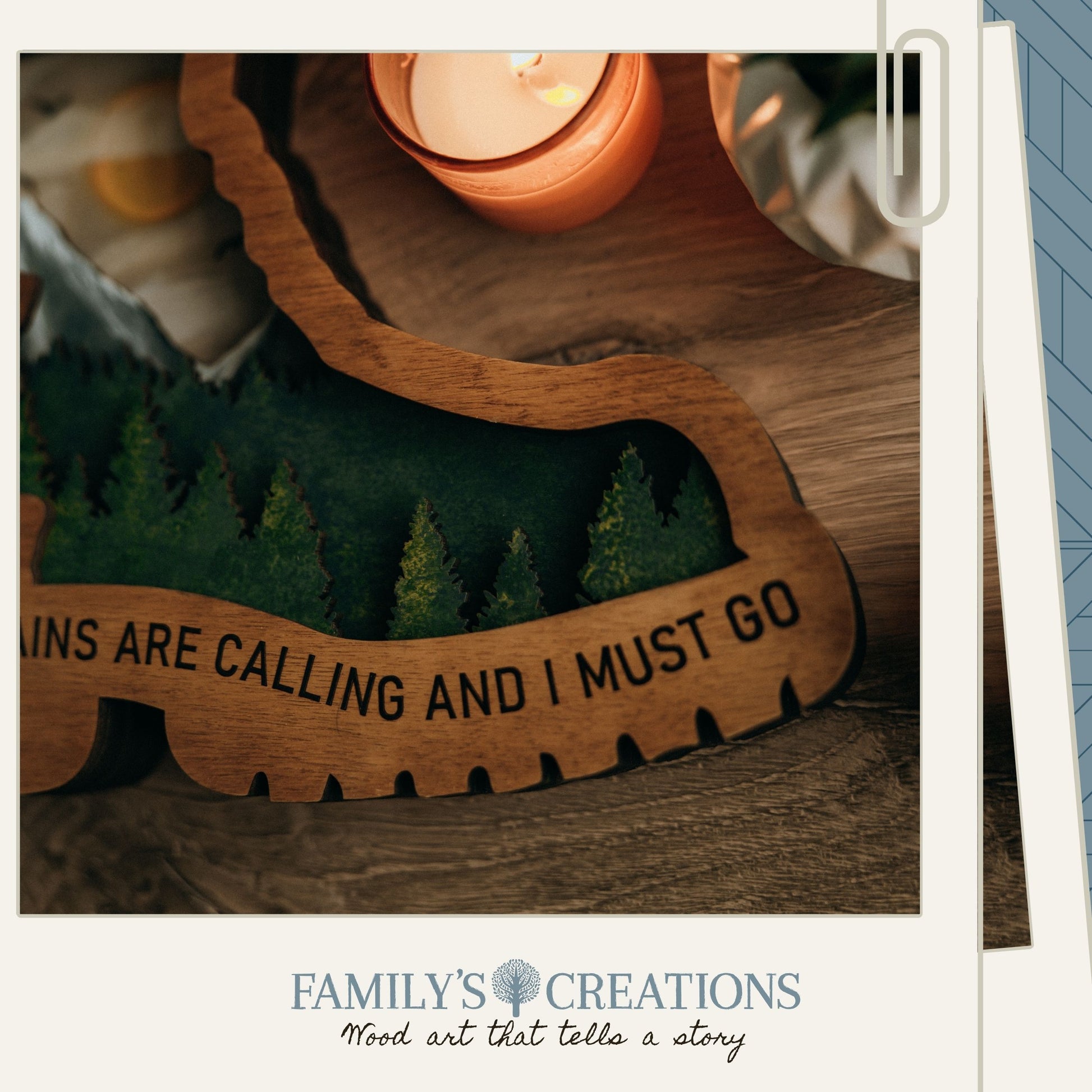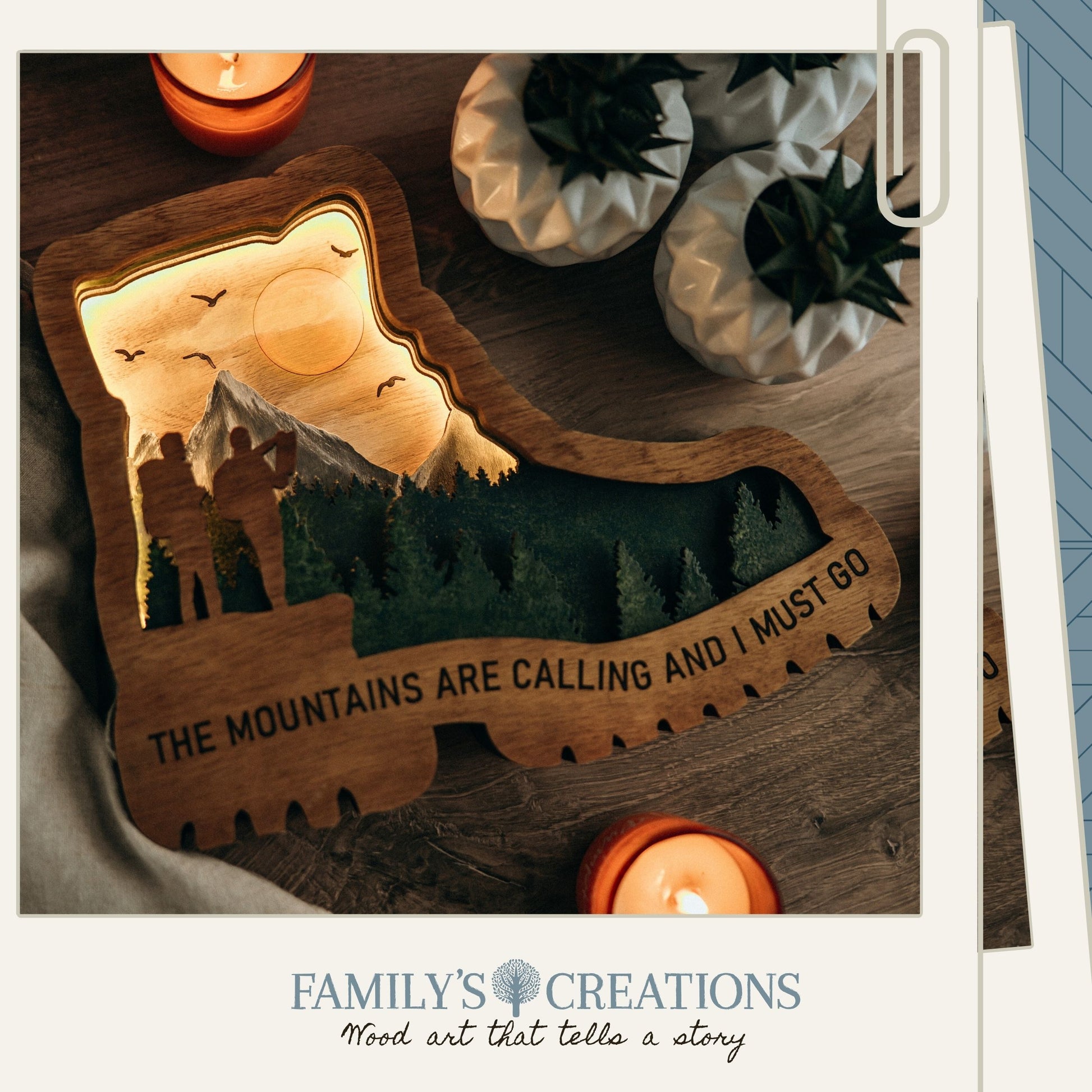 This handcrafted wood art piece brings the spirit of the trail into your home — a layered mountain scene tucked inside the silhouette of a worn-in hiking boot, glowing softly with a warm, ambient backlight.