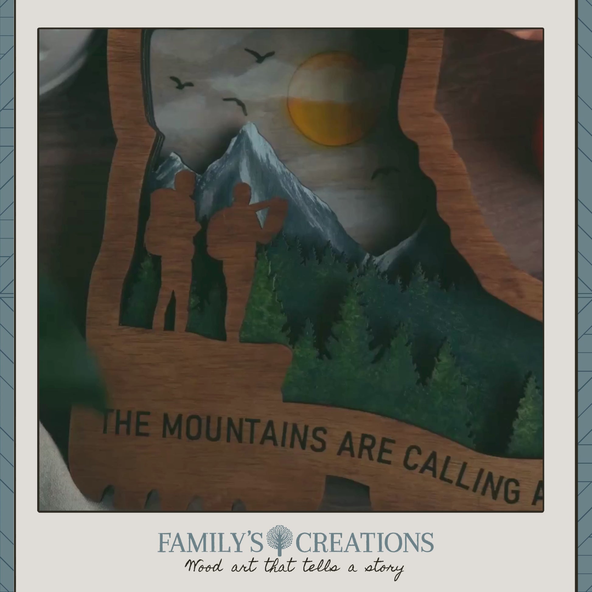 Each design features 8 precision-cut layers, stained and assembled to highlight the natural grain and the story it carries. The hand-painted scene adds an extra touch of soul — and no two are ever quite the same. Every grain, every stroke, every soft glow tells a different story, just like the trails we walk.